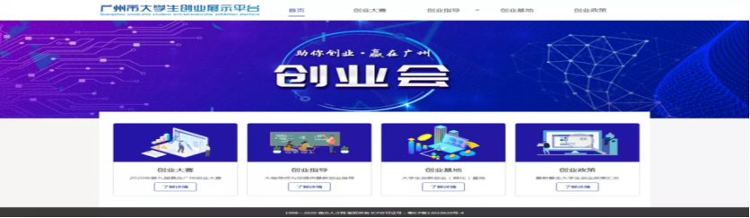 广州市大学生创业展示平台官网设置了“创业大赛”、“创业指导”、“创业基地”、“创业政策”共四大主要功能版块。