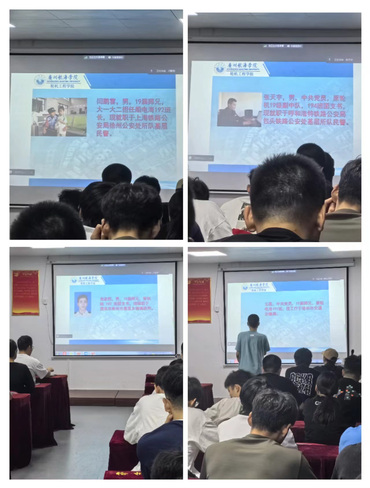 为进一步加强与校友联系,坚持榜样引领,弘扬先进力量,以党建引领帮助广大广航学子树立正确的人生观、价值观和做好职业规划,值此国考来临之际,我校毕业生就业指导中心于11月9日晚在轮机楼511通过腾讯会议举办了“对话青春榜样”系列活动。本期特邀了王昊、吴家熙、张天宇、闫鹏雲四位19级校友作考公经验分享。学院学生第二党支部书记赵垒老师、各年级学生代表参与活动,活动由党务团队代表轮机215谈岳同学主持。