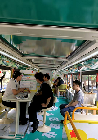 本次招聘会首次引进“湾区就业BUS”,丰富了学生们的求职体验。作为创新型线下移动服务驿站,“湾区就业BUS”外观设计富有活力,内部功能分区清晰,还提供简历打印、AI面试模拟、政策智能查询、直播带岗查询等多元就业服务,新奇的求职体验吸引了众多求职者。在“湾区就业BUS”上,毕业生依序进行刷脸签到打卡、参与互动问答、许下求职心愿、填写活动调研问卷,而后踏入求职面试环节……这种求职模式兼具创新性与趣味性,深受求职学生的喜爱与好评,成为此次招聘会一大亮点。求职者表示:“‘湾区就业BUS’这种形式新颖独特,不论是外观还是内部装饰都很吸引人,双层巴士空间也都很好利用起来,是非常特别的一次求职体验”。