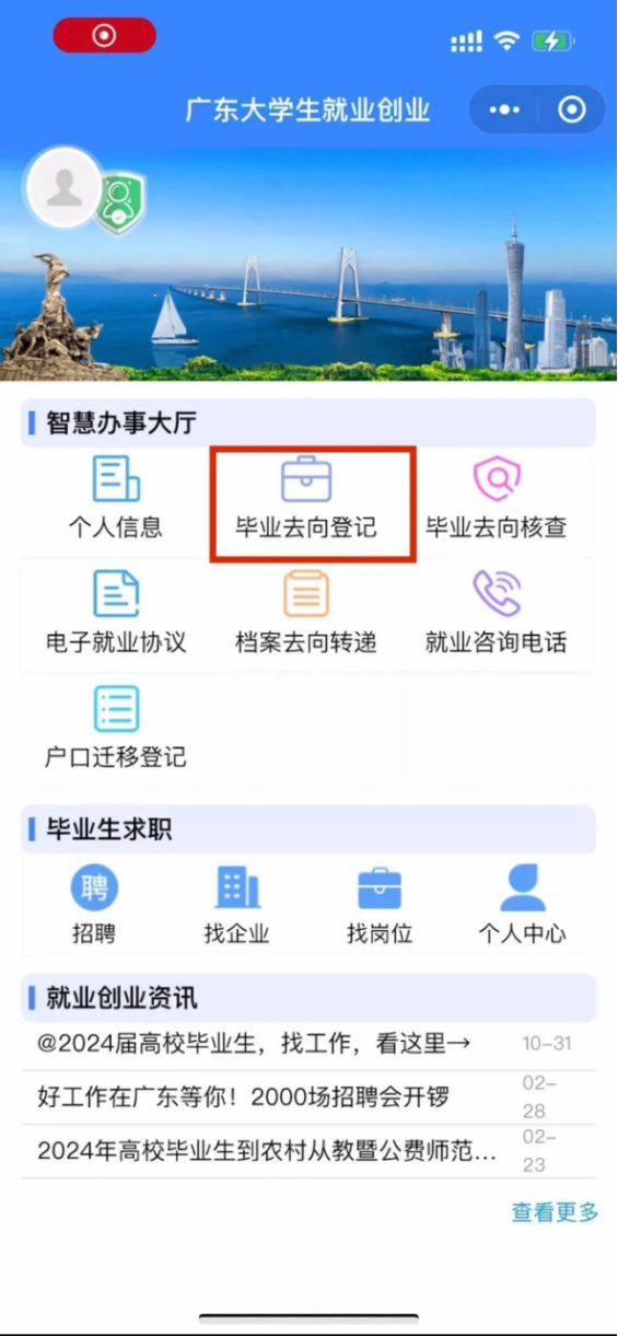 (1)登录广东大学生就业创业小程序,进入“智慧办事大厅”——(2)选择系统中的【毕业去向登记】模块填写——选择毕业去向类型——填写要求的字段——(3)确认提交。