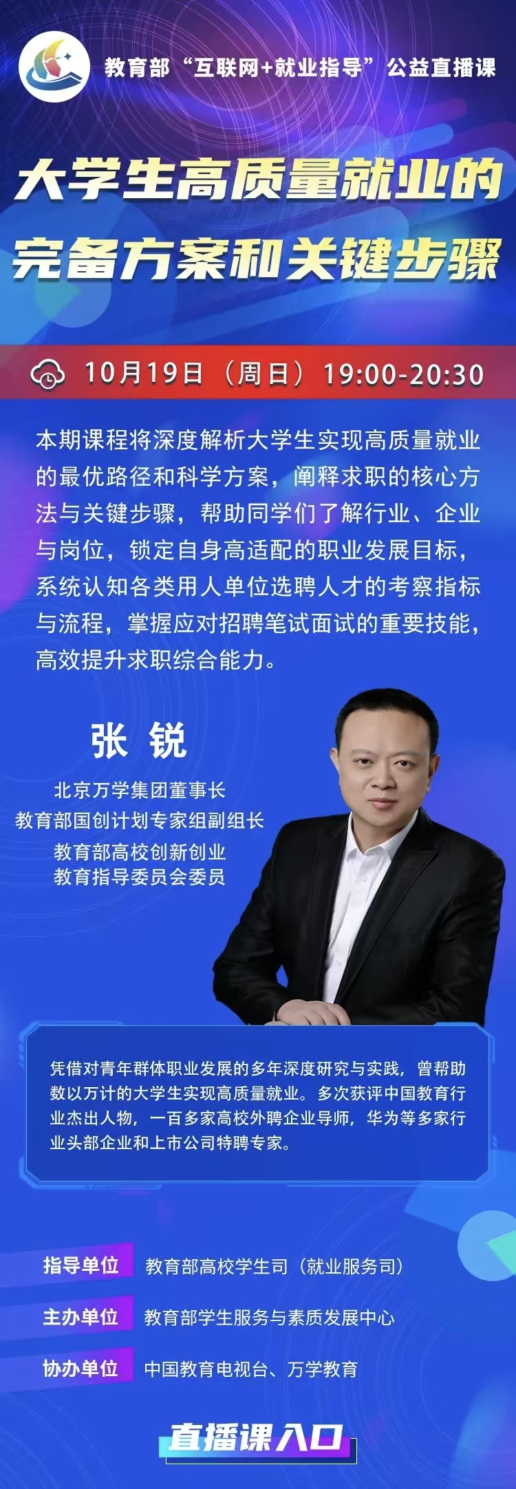 3044AM永利集团 | 教育部“互联网+就业指导”公益直播课:大学生高质量就业的完备方案和关键步骤